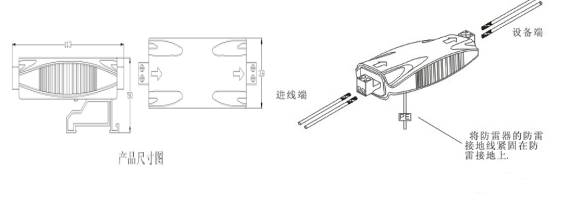 在被保護設(shè)備的線路接口前端串聯(lián)接入避雷器,“OUT”為設(shè)備端、“IN”為進線端,將避雷器接地端與防雷地線(推薦接地電阻≤4Ω)作良好的電氣連接。